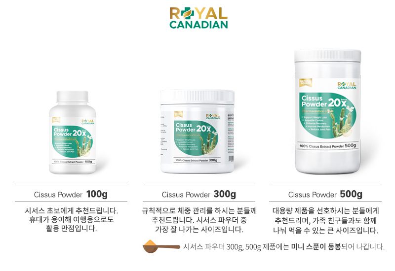 캐나다 로얄캐네디언 시서스 가루 분말 3종 캐나다 로얄캐네디언 시서스 파우더 가루 분말은 100g, 300g, 500g 제품으로 구성되어있습니다.