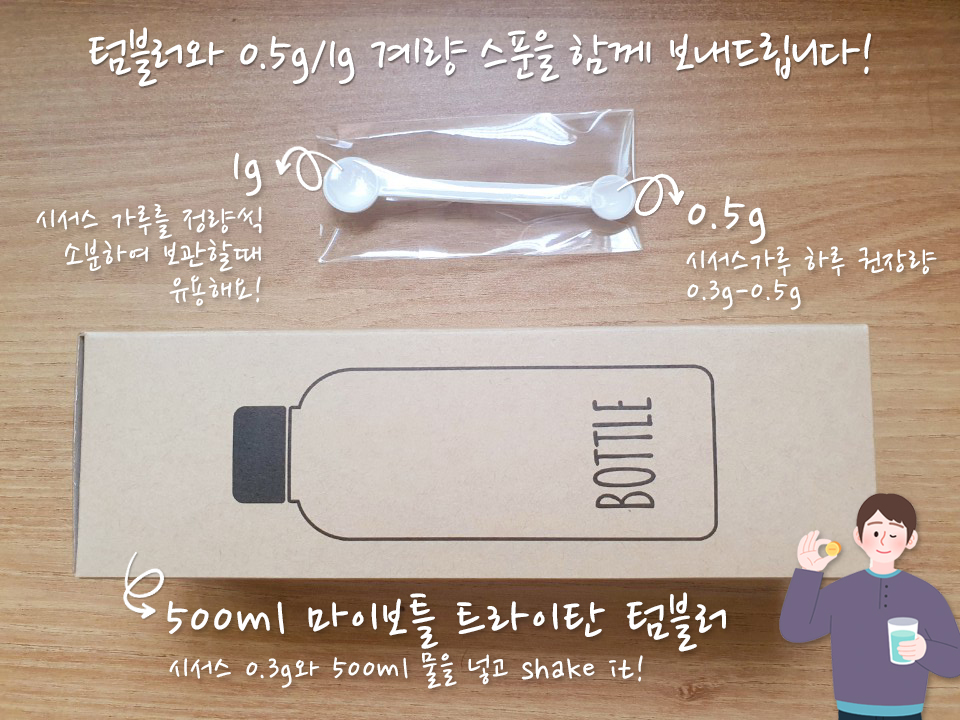 이벤트에 참여해주시는 분들께 텀블러와 0.5/1g 겸용 계량 스푼을 함게 보내드립니다! 이벤트 페이지를 참조해주세요~